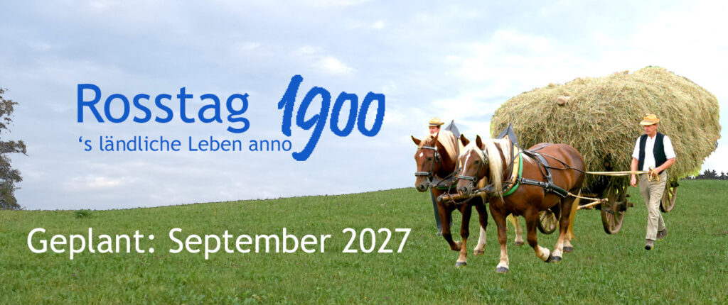 Das Pferd war um 1900 noch der wichtigste Helfer des Bauern. Deshalb steht es neben den historischen Gerätschaften auch im Mittelpunkt des Rosstages. Über 300 herausgeputzte Rösser verschiedener Rassen sind in unterschiedlichen Anspannungen zu bewundern: von einem einspännigen Gäuwagerl bis hin zu einem mächtigen Baumfuhrwerk mit schweren Kaltblutpferden.